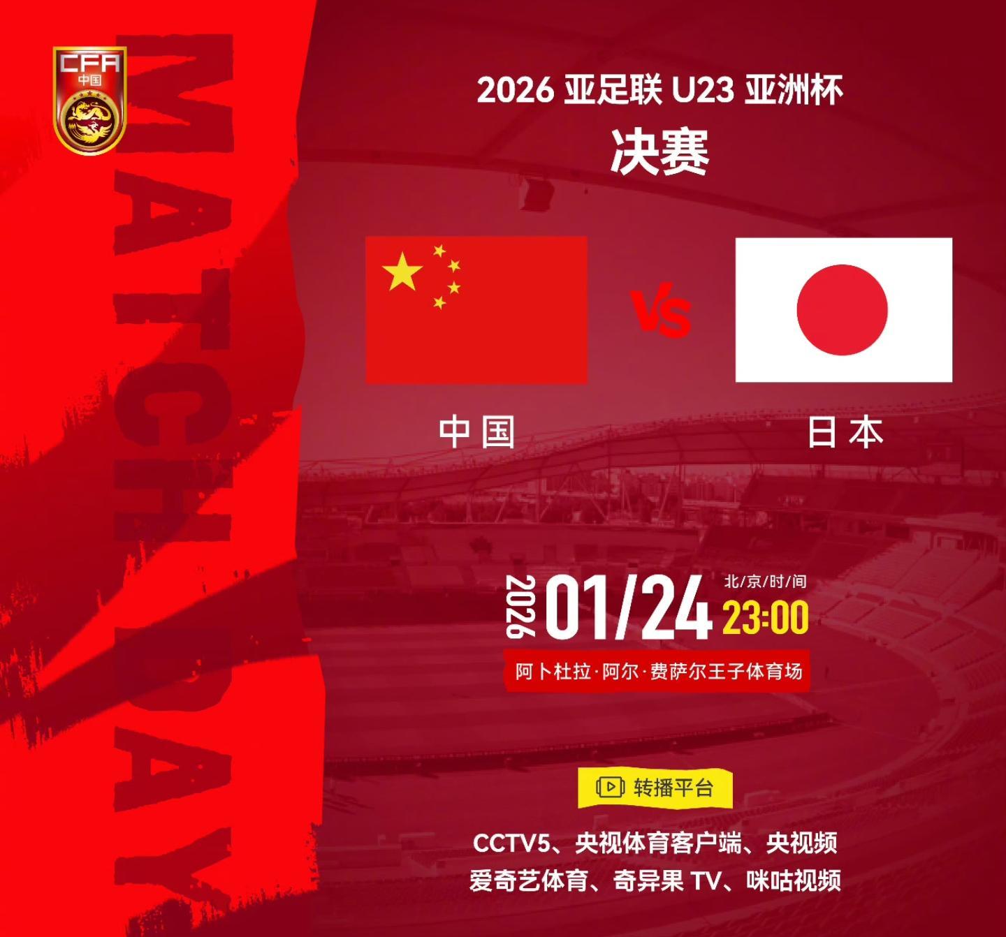 北京时间2026年1月24日消息。今天晚上11点,U23亚洲杯就将迎来决赛,中国队VS日本。目前已经知道,CCTV5直播,并且在网络平台上,詹俊老师也将解说本场比赛。最近半个月,对于中国球迷来说是开心和快乐的:1月8日,国足U23首战伊拉克,一场0-0但不是闷平,国足防守打的很坚韧,李昊的扑救很潇洒!随后,1月11日,国足1-0击败澳大利亚,中后卫彭啸的抽射...